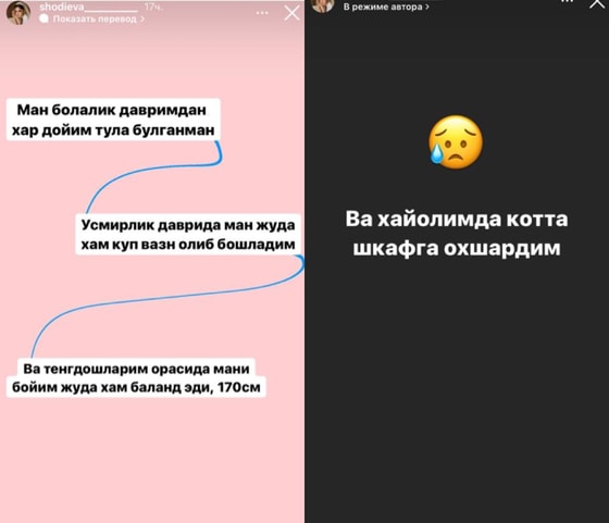 По словам Рахшоны, она сравнивала себя с «огромным шкафом». Девушка не боится говорить об этом подписчикам, потому что чувствует поддержки с их стороны. Она уверена, что не подвергнется осуждению.
