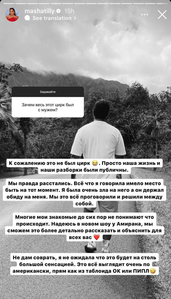 К сожалению, это был не цирк. Просто наша жизнь и разборки были публичны. Мы правда расстались. Все, что я говорила имело место быть на тот момент. Я была очень зла на него, и он держал обиду на меня. Мы это все проговорили и решили между собой, — написала девушка.