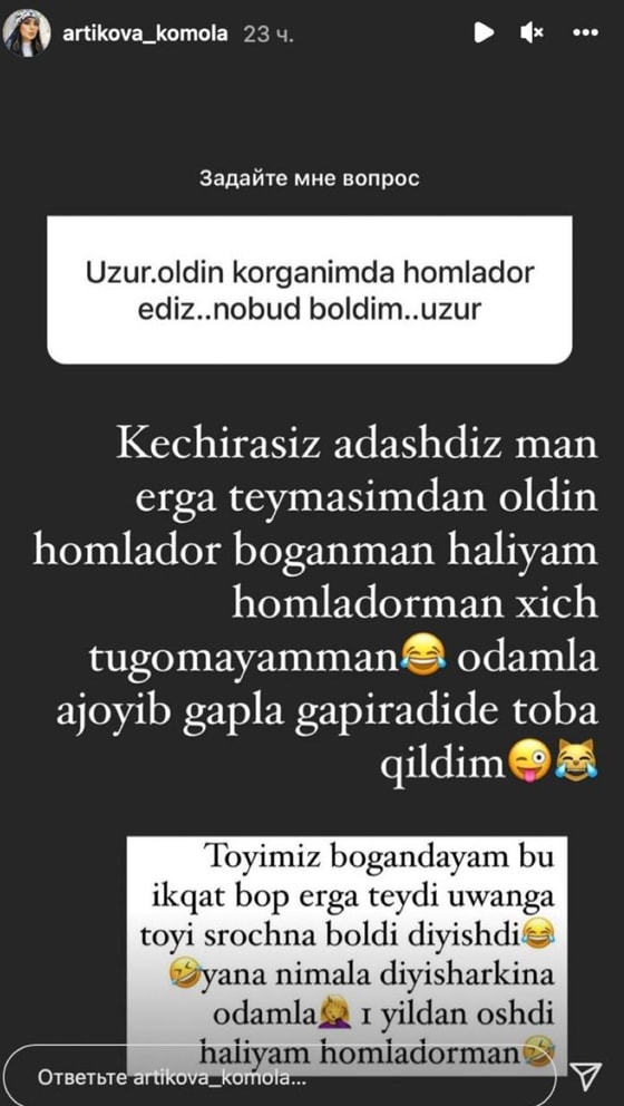 Экс-возлюбленная бывшего участника группы «Уммон» Зохида Рихсиева Камола Артикова, отвечая на вопросы поклонников, призналась беременна она или нет.