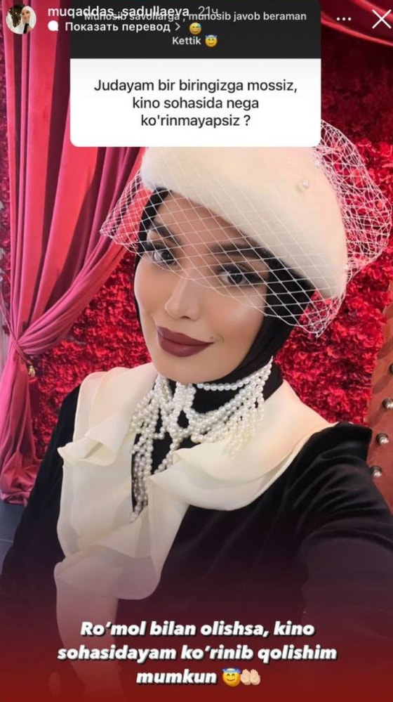 Казалось бы, совсем недавно Мукаддас Садуллаева отвечала на вопросы поклонников о ее внешнем виде. Актрисе приходится прятать свой хиджаб под различными головными уборами.