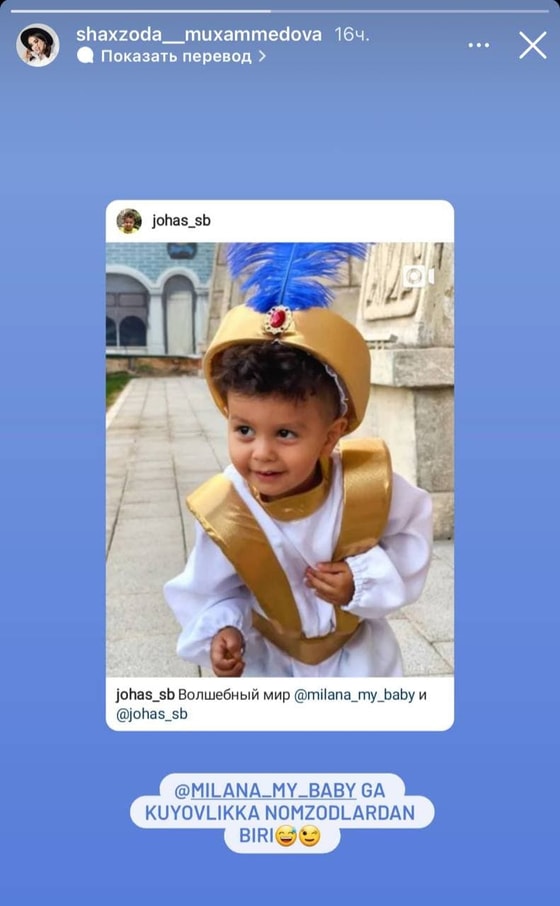 Мухаммедова поделилась роликом, на котором ее дочь и маленький тиктокер Джахонгир Сабритдинов примерили не себя образы главных героев легендарного мультфильма «Алладин».
