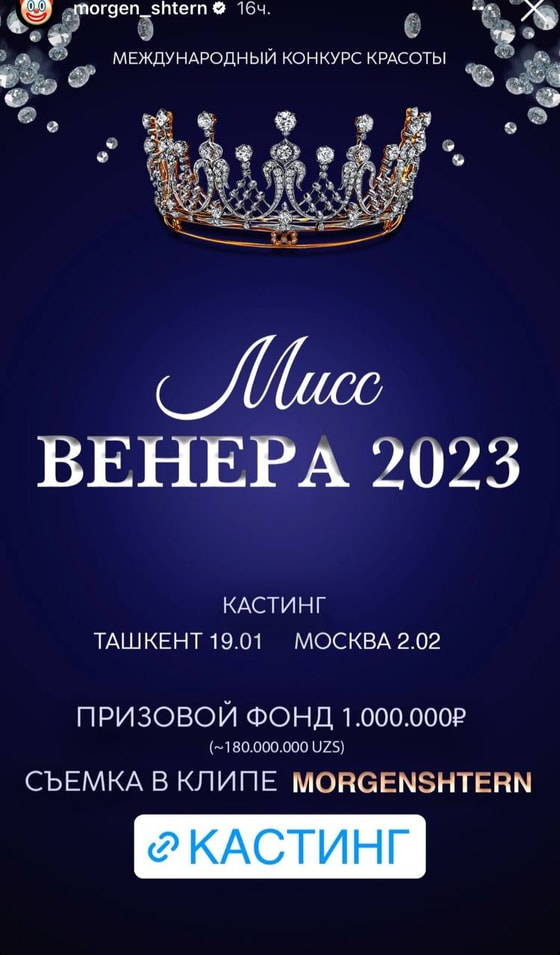 Российский исполнитель Моргенштерн проведет конкурс красоты для девушек «Мисс Венера 2023». К слову, мероприятие пройдет в Ташкенте.