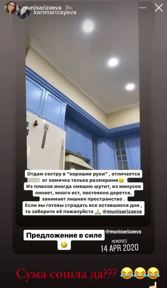 Сестренка популярной узбекской певицы Мунисы Ризаевой Карима Ризаева опубликовала stories, в котором готова «отдать» свою сестру в надежные руки.