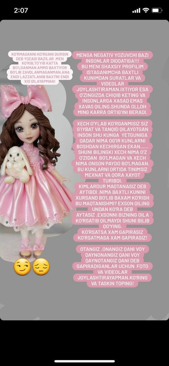 Недавно звезда опубликовала в stories длинный пост, в котором обратилась к своим хейтерам, которых раздражает то, что Шахзода постоянно выкладывает счастливые фотографии и видео.