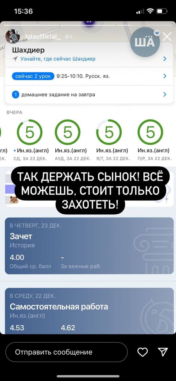 На этот раз Лола поделилась успехами своего сына Диёра. Она выложила скриншот с электронного дневника, в котором видны положительные оценки ребёнка.