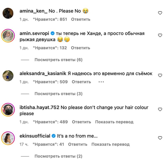 «Зачем?», «Не очень. Брюнеткой было лучше», «Как ты могла», «Ты теперь не Ханде, а просто обычная рыжая девушка», – пишут пользователи.