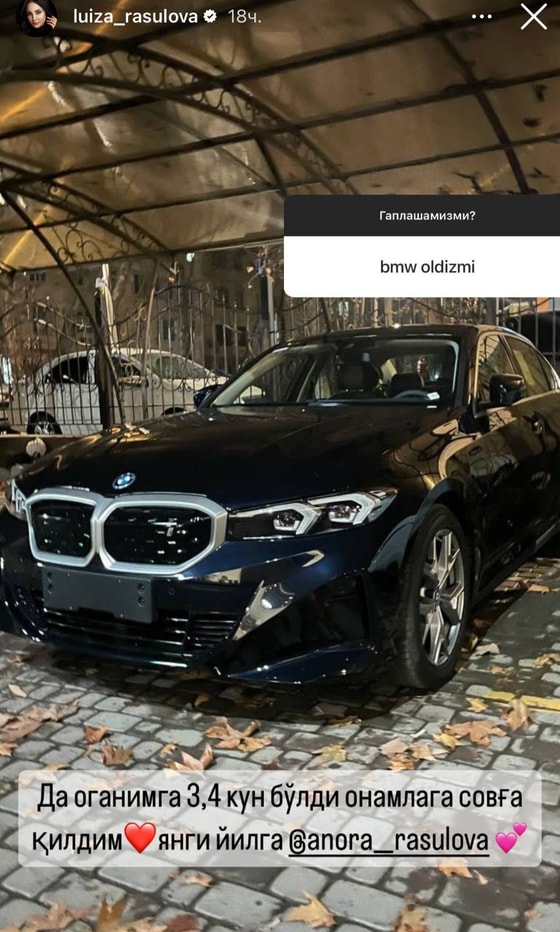 Киноактриса узбекского шоу-бизнеса Луиза Расулов решила обрадовать маму роскошным подарком. Девушка рассказала, что на днях подарила ей авто марки BMW i3. Цена машины варьируется от $42 тысяч до $45 тысяч.