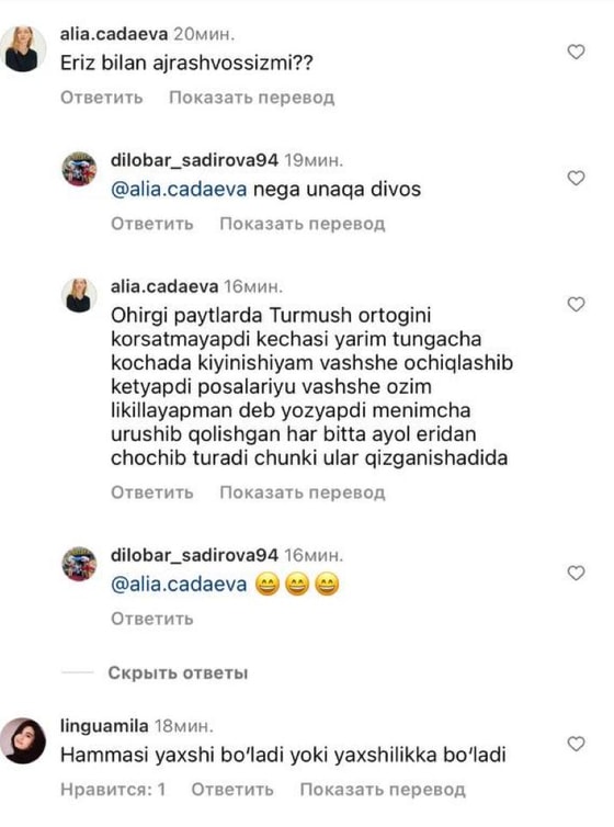 «Вы разводитесь с мужем?», «В последнее время вы постоянно тусуетесь где-то, одеваетесь не подобающе и вообще не публикуете мужа. Кажется, они поссорились, потому что мужчина ревнует и не позволит так ходить своей супруге», «Не переживайте, у вас все наладится», – написали пользователи.