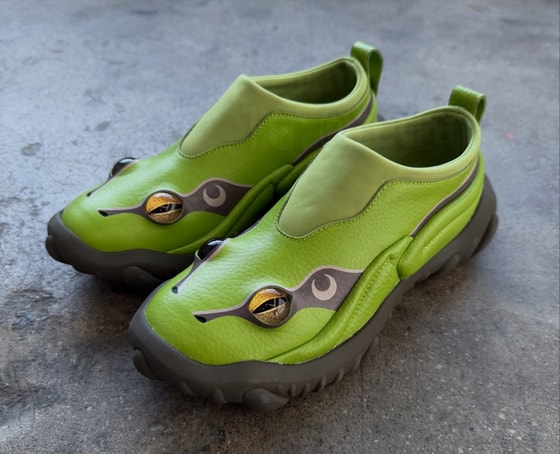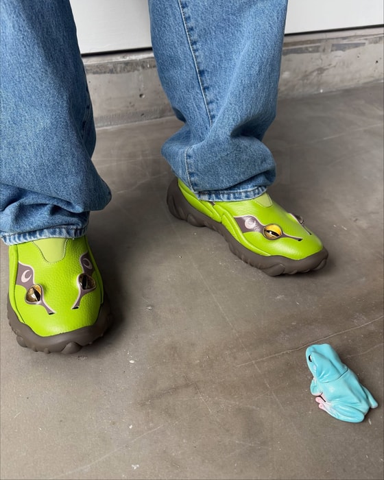 Американский бренд Esenes представил провокационную новинку — кроссовки Frog Clog, дизайн которых вдохновлен лягушками. Модель выполнена из зеленой натуральной кожи с текстурой, имитирующей кожный покров амфибии, и дополнена парой реалистичных глаз на мысках.