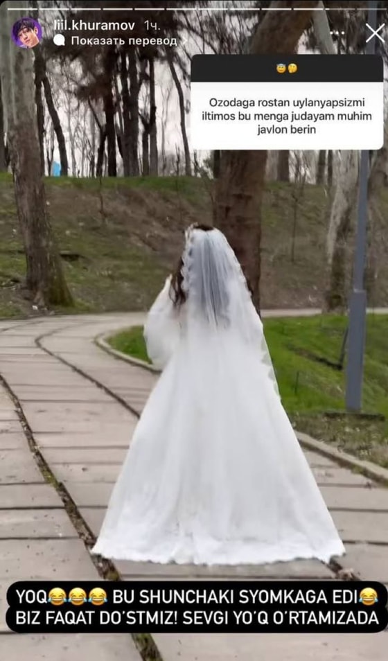 Он поделился Stories из машины, в которой держит за руку девушку в белом свадебном платье. Неожиданностью стало то, что его подруга Озода опубликовала то же самое фото.