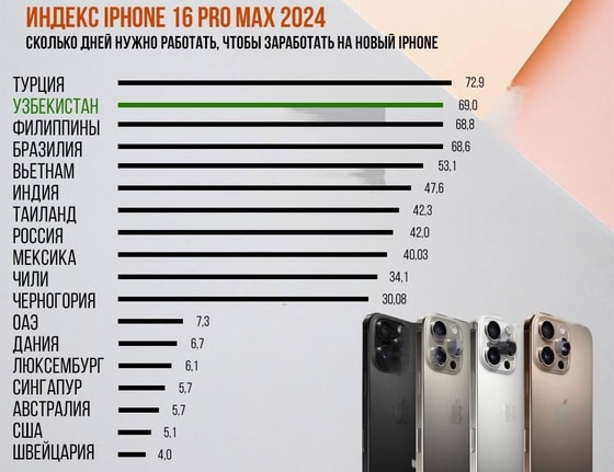 Для сравнения, в Швейцарии на iPhone можно накопить всего за 4 дня работы, а в Узбекистане — за 97 дней. Эти цифры подчеркивают разницу в покупательной способности и уровне жизни между странами.
