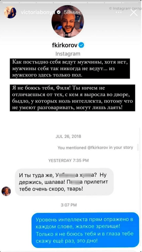 Телеведущая Виктория Боня продолжает развивать скандал с Филиппом Киркоровым в соцсетях. По ее словам, она не побоялась пойти против короля российской эстрады.