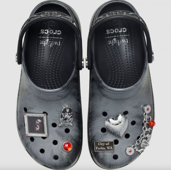 Первая пара — Classic Platform Clog, вдохновленная образом Беллы. Черные сабо на платформе украшены блестками и тонким принтом с силуэтами деревьев, отсылающим к пейзажам Тихоокеанского Северо-Запада, где разворачиваются события фильма. Ремешок декорирован узором в виде виноградной лозы и серебряной кнопкой с надписью «Сумерки». В комплекте идут тематические джибитсы: браслет с подвеской-животным, сердце-медальон, фото Беллы и Эдварда и табличка с названием города Форкс.