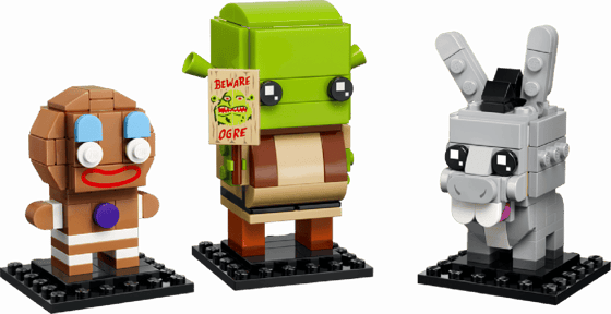 Для юных поклонников от 10 лет выпущен набор коллекционных фигурок в стиле BrickHeadz. Из него можно собрать Шрека, Осла и Пряничного человечка.