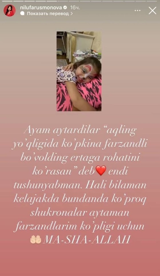 Многие поклонники узбекской исполнительницы Нилюфар Усмановой говорят о ней, как о матери-героине. Известно, что артистка занимается воспитанием пятерых детей.