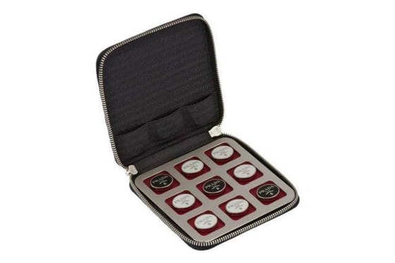 Набор для крестиков-ноликов от Prada состоит из белых и черных фишек с логотипом компании и сафьянового чехла — из того же материала, который идет на фирменные сумочки. Чехол отделан глянцевой молнией Riri — это и есть самый дорогой элемент.