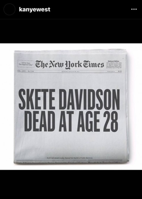 Рэпер в своем стиле отреагировал на распад отношений экс-супруги. Он потроллил Пита – он опубликовал обложку газеты The New York Times с заголовком «Скит Дэвидсон умер возрасте 28 лет» (Skete Davidson Dead At Age 28). Согласно Urban Dictionary, skete — худой, бледный парень твоей бывшей.