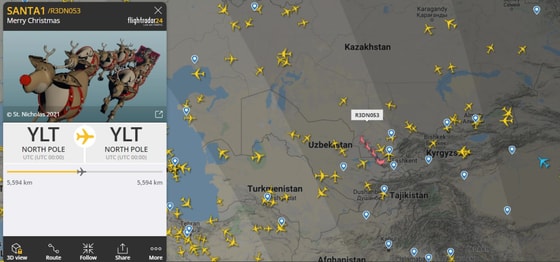 Оказалось, что над Узбекистаном пролетел борт с названием Santa 1, который был в виде оленьей упряжки. Экипаж летит в сторону России, а за его движением следят 17 тысяч человек в реальном времени.