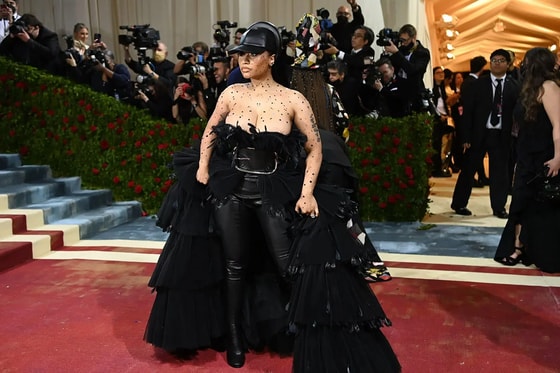 Ники Минаж в прошлом году выступила против обязательной вакцинации участников Met Gala. В этом году здесь и у нее на голове бейсболка с повязкой.