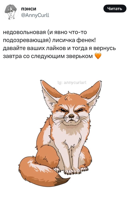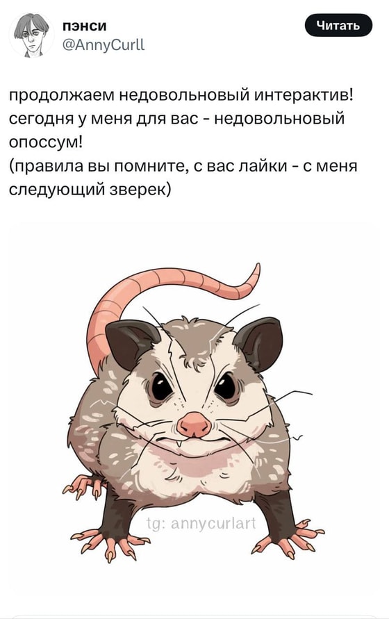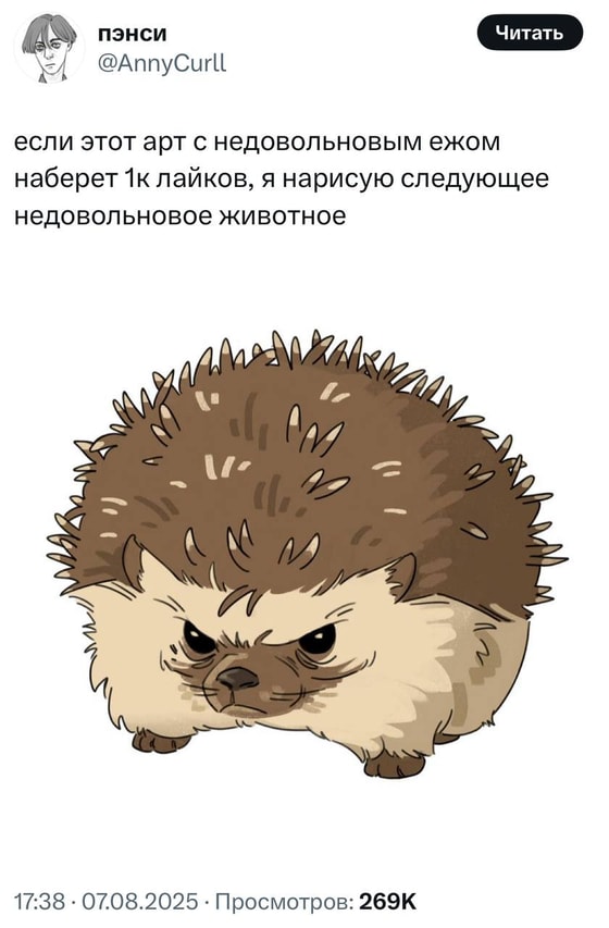 Художница из соцсети X запустила милый челлендж: она рисует животных с недовольными мордочками, а выбор следующего персонажа зависит от количества лайков под постом. Идея быстро завоевала популярность — публикации набирают сотни тысяч просмотров, а лайки приходят мгновенно.