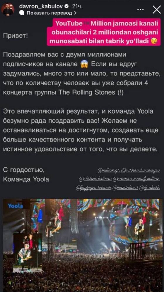 Отечественный юморист и ведущей популярного юмористического шоу «Миллион» Даврон Кабулов поделился радостной новостью о его команде. Как оказалось, YouTube-канал коллектива смог набрать 2 млн подписчиков.