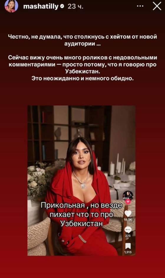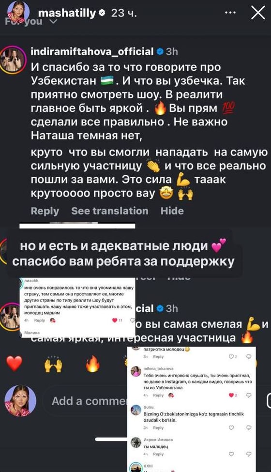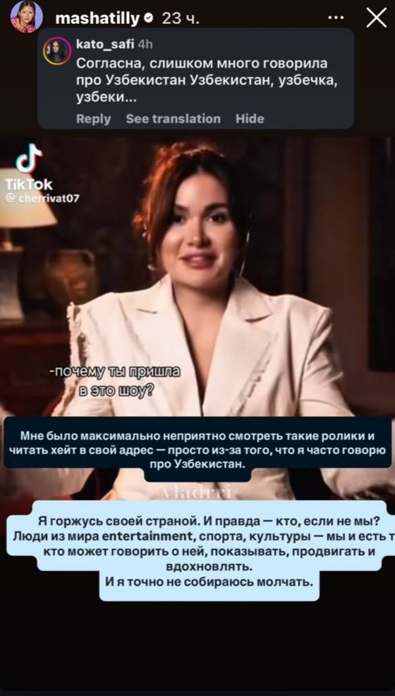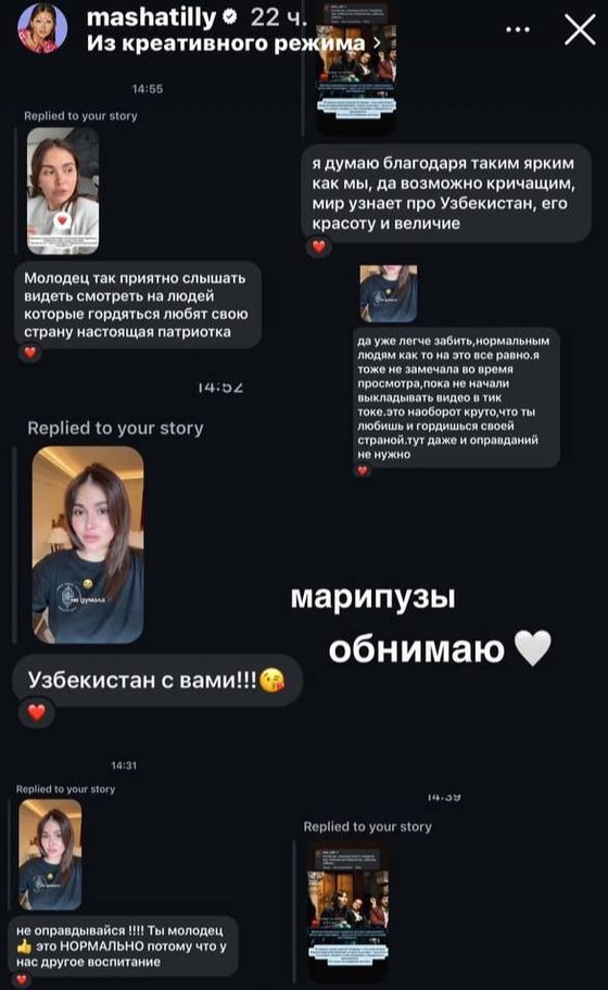 Тилляева также отметила, что раньше ей приходилось сталкиваться с негативом в адрес своей внешности и профессии, но критика за национальную идентичность — новая для неt ситуация. Тем не менее, блогерша дала понять, что менять свою позицию не собирается и продолжит говорить об Узбекистане с гордостью.