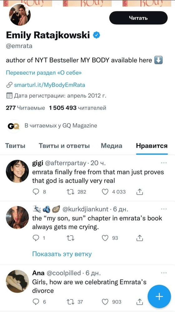 «Эмили наконец свободна», «Девочки, как мы будем отмечать развод Ратаковски», — пишут подписчики, а модель ставит «Нравится» на эти посты.