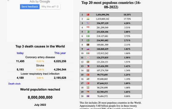 В топ-10 самых населенных стран мира входят: США, Индонезия, Пакистан, Нигерия, Бразилия, Бангладеш, Россия и Мексика. Сайт также рассказал, что самой распространенной причиной смерти стали: ишемическая болезнь сердца, инсульт и инфекции нижних дыхательных путей.