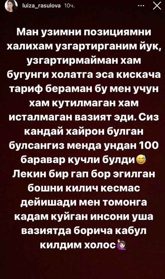 Спустя несколько дней после небольшого конфликта, произошедшего во время передачи Aldama meni, актриса Луиза Расулова прокомментировала свое состояние.