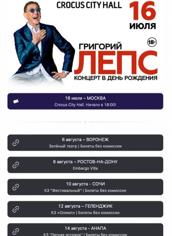 Сегодня, 6 июля появилась информация, что следом за Казахстаном концерт российского певца Григория Лепса отменили в Кыргызстане. Выступление артиста должно было состояться 2 августа, однако пользователи высказались против мероприятия. В результате, это послужило поводом для отмены концерта.