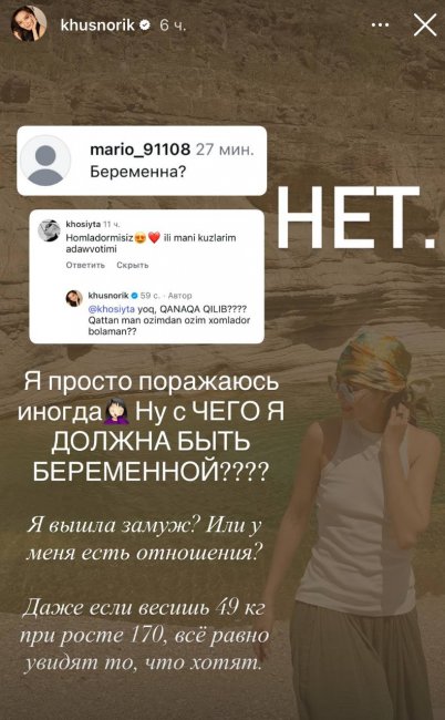 Известная узбекская блогерша и телеведущая Хуснора Шадиева прокомментировала слухи о своей предполагаемой беременности, которые активно обсуждались в сети.