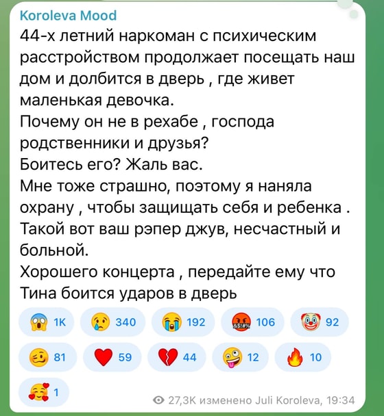 По словам Юлии, она наняла личного телохранителя, так как боится действий бывшего рэпера. Она также отметила, что сотрудники полиции не могут оказать ей помощь, а родственники не вмешиваются, так как боятся Гуфа.