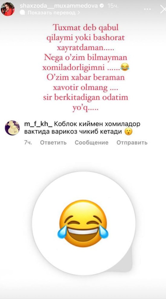 Принять ли это за клевету или пророчество? Я удивлена. Если бы я была беременна, то сообщила бы вам. Не волнуйтесь, – сказала Шахзода Мухаммедова.