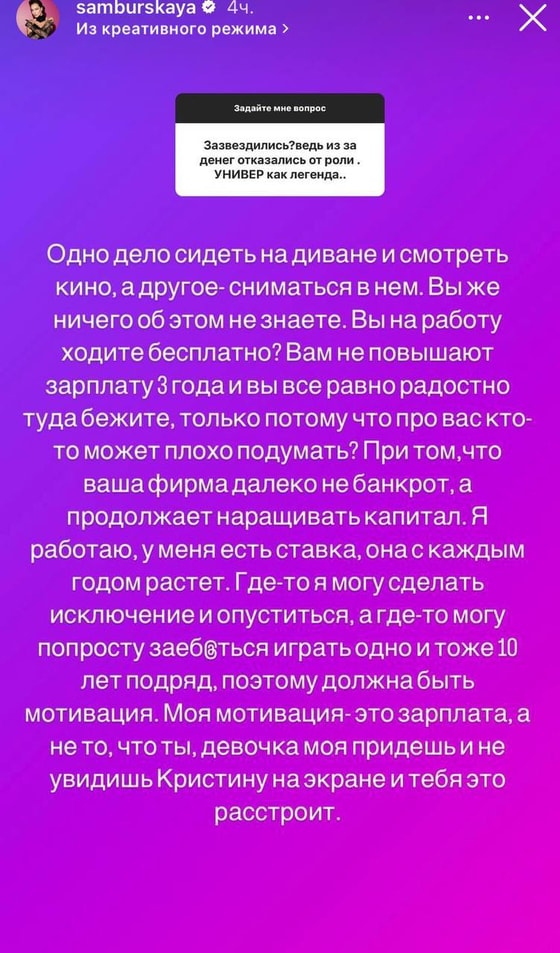 Однако Настасьи Самбурской, которая исполнила роль Кристины в этом списке не оказалось. Поклонники актрисы посчитали, что звезда «зазвездилась». Девушка решила еще раз ответить зрителям и объяснить свой выбор.