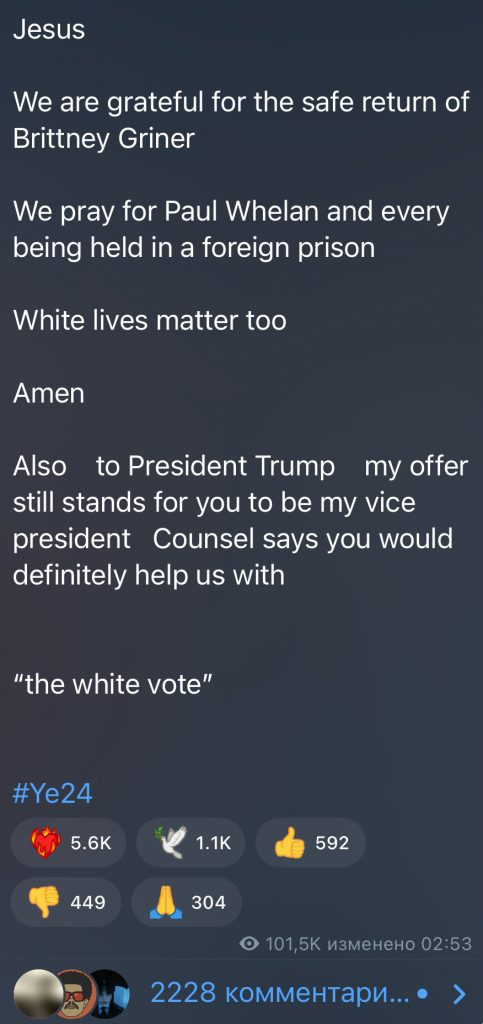 Я, Йе, согласен сесть за стол переговоров с Президентом Владимиром Путиным в Москве 15 декабря 2022 года. Эта встреча предназначена для обсуждения различных вопросов, но не ограничивается возможным помилованием Бриттни Грайнер, американской гражданки, удерживаемой в России. Искренне, Йе, – написал рэпер.