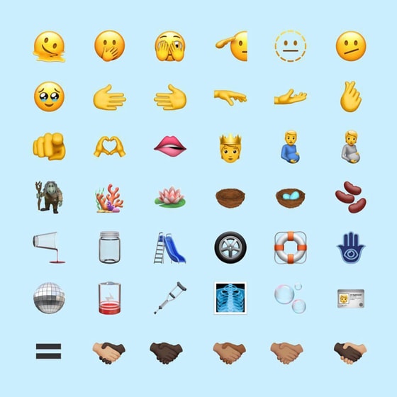 Посмотрев на картинку можно увидеть новые объекты: классические желтые смайлики с несколькими «лицами», которые отдают честь, прикрывают рот, подсматривают, плавятся. Также есть эмодзи с рукопожатиями людей с разным цветом кожи и несколько новых жестов.