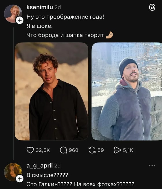 Волна обсуждений началась после того, как Галкин выложил несколько снимков, на которых он позирует в стильном casual-луке: серая толстовка, шапка и ухоженная борода. Новый образ кардинально отличался от его прежнего публичного имиджа и был воспринят аудиторией как «глоу-ап». Пользовательницы засыпали артиста комплиментами, отмечая, что он вступил в свою «прайм-эру», и с юмором добавляли, что Алла Пугачева «инвестировала» в своего мужчину «на стадии котлована».