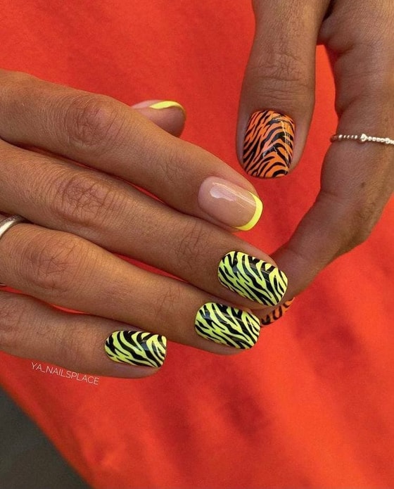 Если хотите выделиться на Новый год, то сделайте «не как у всех». Вариант выпадает на яркие кислотные цвета и веселые рисунки. Кстати, можно добавить наклейку или рисунок в виде тигренка.