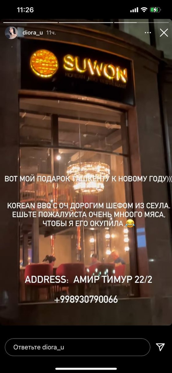 Бизнесвумен и блогер Диера Усманова сделала подарок узбекистанцам на Новый год. Звезда открыла собственный ресторан Swon в самом центре столицы. Этой новостью она поделилась на своей страничке в Instagram.