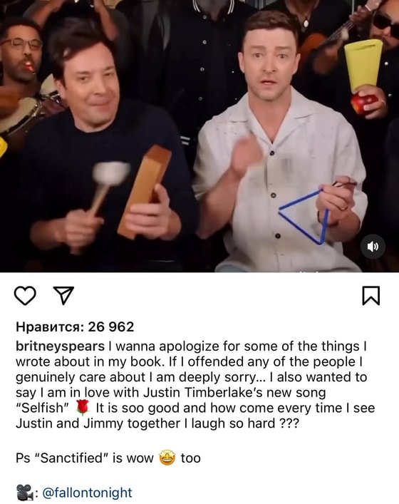Хочу извиниться за некоторые вещи, о которых писала в своей книге. Если я обидела кого-то, кто мне искренне дорог, я глубоко сожалею. Я также хотела сказать, что влюблена в новую песню Джастина Тимберлейка. Она очень классная. И почему каждый раз, когда я вижу Джастина и Джимми вместе, я так сильно смеюсь? – написала она.