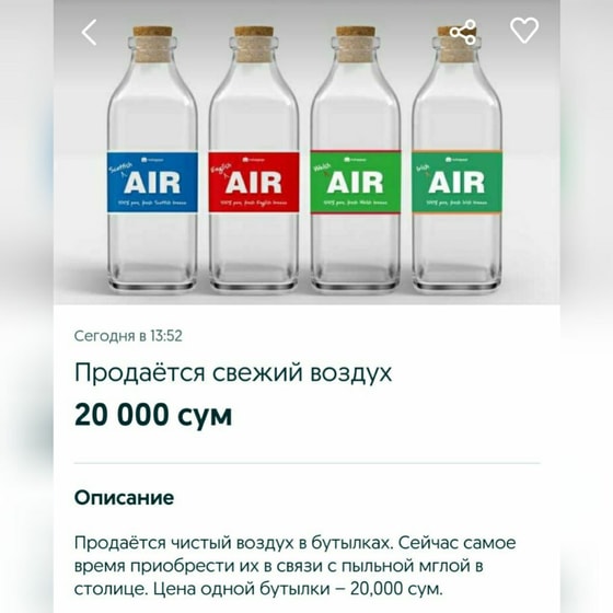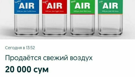 Жителям столицы порекомендовали носить маску на улице и закрыть окна во избежание загрязнения наружным воздухом. Некоторые жители решили воспользоваться случаем – пользователь платформы OLX разместил объявление о продаже воздуха в бутылках.