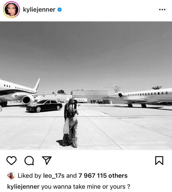 На фотографии миллиардерша стоит в обнимку со своим бойфрендом, рэпером Трэвисом Скоттом между двумя частными самолетами.