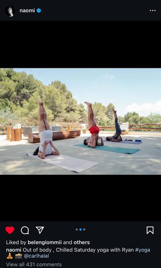 Мама двоих детей опубликовала на своей страничке в Instagram фото, на котором занимается йогой в компании испанского актера Джона Кортахарены и звезды «Форсажа» Мишель Родригес. Наоми выполнила несколько асан, завершив упражнения стойкой на голове.