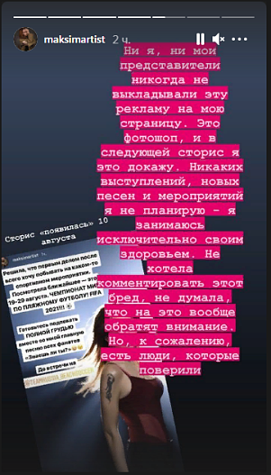 Ни я, ни мои представители не выкладывали эту рекламу на мою страницу. Это фотошоп. И в следующих stories я это докажу. Никаких выступлений, новых песен и мероприятий не планирую — я занимаюсь исключительно здоровьем. Не хотела комментировать этот бред, не думала, что на это вообще обратят внимание, но, к сожалению, есть люди, которые поверили,