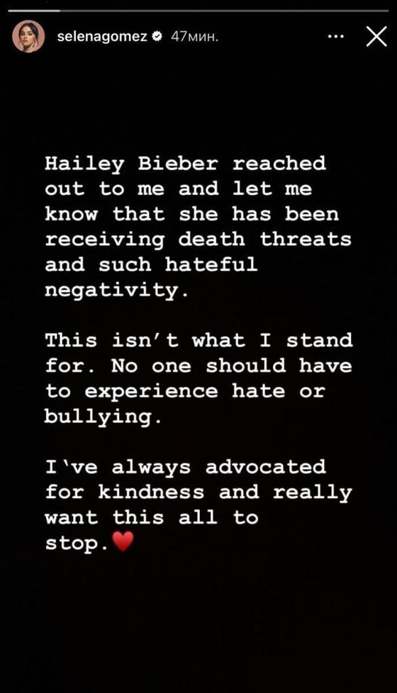Хейли Бибер связалась со мной и сообщила, что ей отправляют сообщения, в которых желают смерти. Это не то, что я поддерживаю. Никого нельзя травить. Я всегда выступала за доброту и очень хочу, чтобы все это прекратилось, – написала певица.