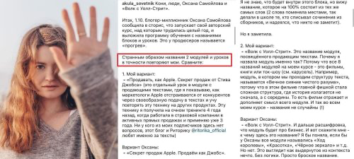 Некая блогерша Анна, начала уверять, что название и сам курс, а более того, темы материалов полностью совпадают с ее курсом «Акула пера», которому уже год. Чтобы доказать свою правоту, она опубликовала несколько фрагментов с урока.