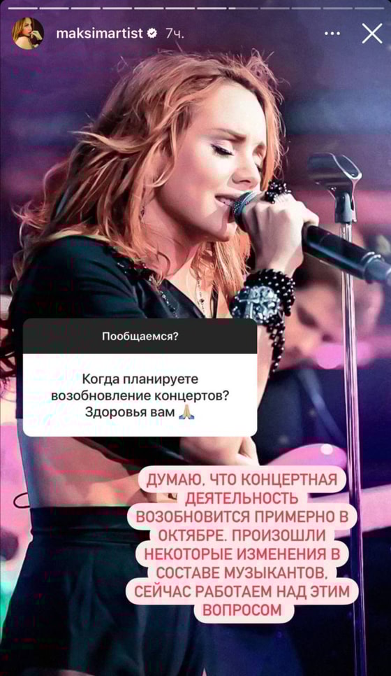 МакSим рассказала о своем восстановлении и добавила, что скорее всего концерты продолжатся уже с октября этого года.