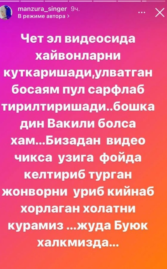 Об этом инциденте уже высказались в обществе защиты животных, но свое мнение добавила и узбекская исполнительница Манзура.