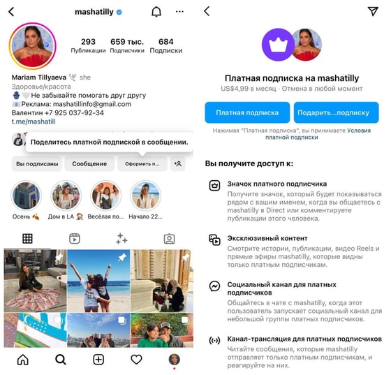 Можно будет смотреть истории, публикации, Reels и прямые эфиры Тилляевой, которые будут доступны исключительно платным подписчикам.