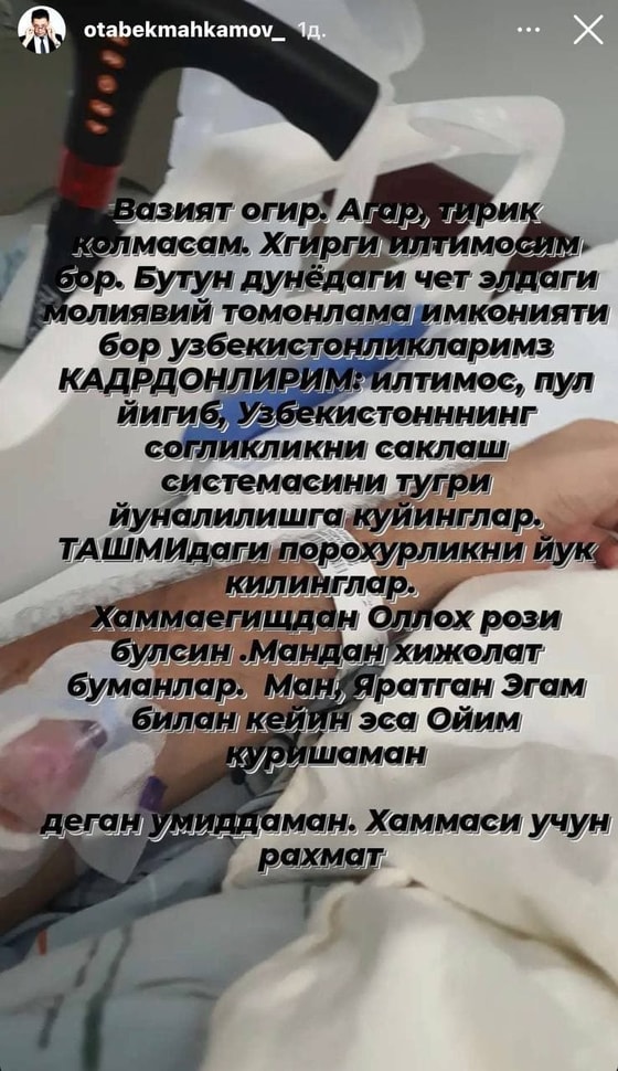 Ситуация тяжелая, если я не смогу выжить то у меня будет одна просьба: хочу обратиться к узбекам, которые находятся за рубежом и в хорошем финансовом состоянии. Пожалуйста соберите деньги и вложите их в улучшение системы здравоохранения в Узбекистане, избавьтесь от коррупции в ТАШМИ,
